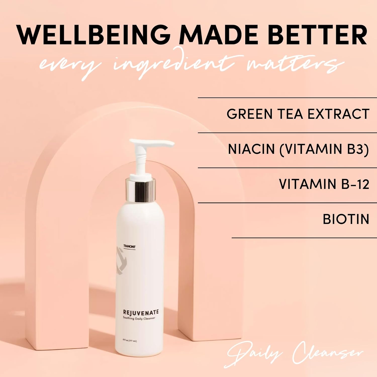 Discover the essence of natural beauty and wellness with Tranont's Rejuvenate Cleanser. Our unique formula combines plant-based ingredients and advanced hydration technologies to cleanse gently yet effectively. Enriched with silk amino acids and sodium hyaluronate, this soothing face wash deeply moisturizes, leaving your skin feeling soft, refreshed, and nourished.Formulated for both immediate and long-term benefits, our cleanser helps enhance hydration, balance skin tone, and support a healthier complexion. Ideal for all skin types, including sensitive, dry, oily, and combination skin, it's the perfect choice for anyone seeking to elevate their skincare routine with a natural, cruelty-free product.How to use: Wet your hands and face with warm water. Pump once into your hands and work into a lather. Gently massage onto your face using circular motions. Rinse off and pat dry. For best results, use morning and night, followed by our Advanced Hydrating Serum.Transform your skin with Tranont's Rejuvenate Cleanser and embrace the beauty of healthier, revitalized skin. With consistent use, you’ll enjoy smoother, softer skin that radiates confidence and vitality. It’s more than just a cleanser—it’s the foundation for refreshed, rejuvenated skin.